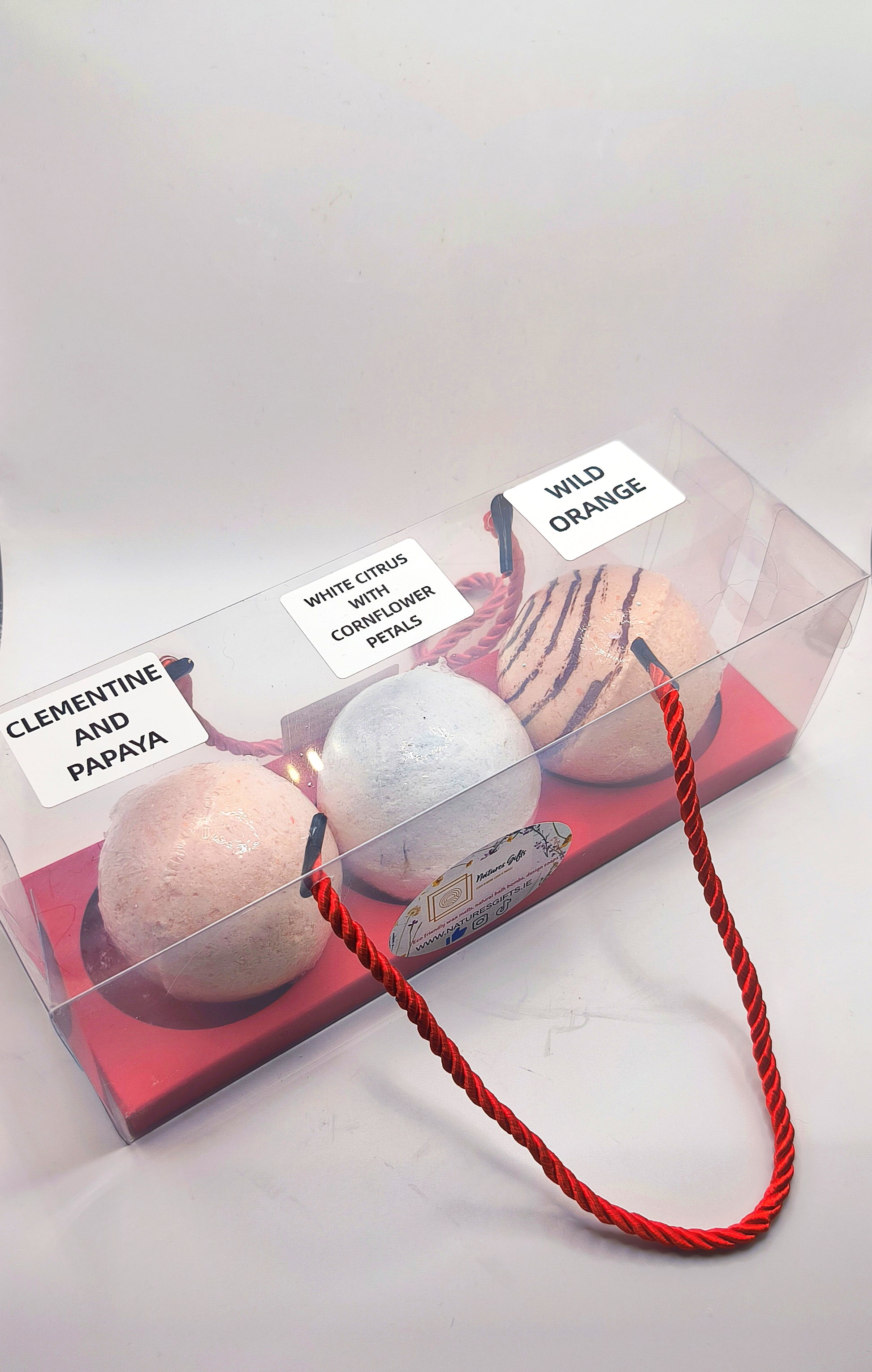 Gift set contains of 3 natural, Handmade Bath bombs - Clementine/papaya, white citrus with cornflower petals, and wild orange.