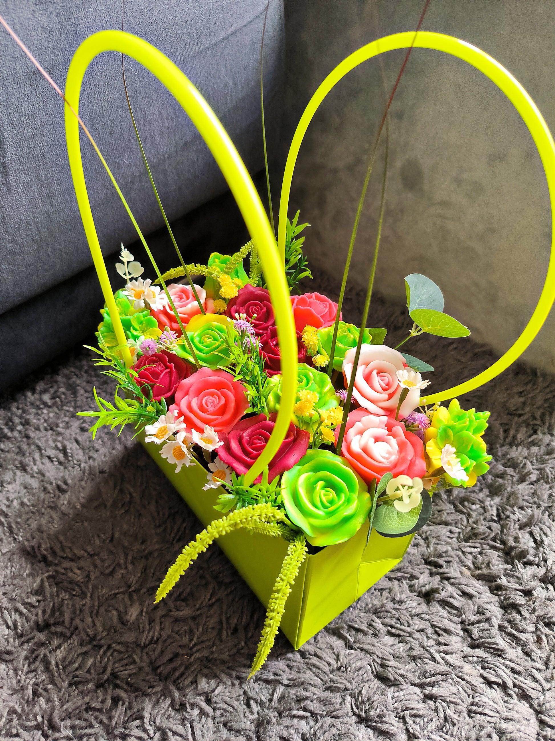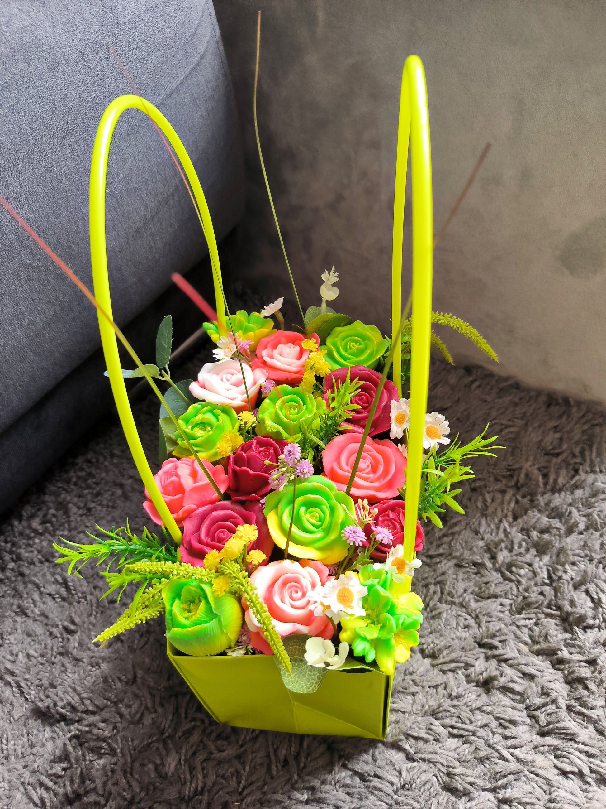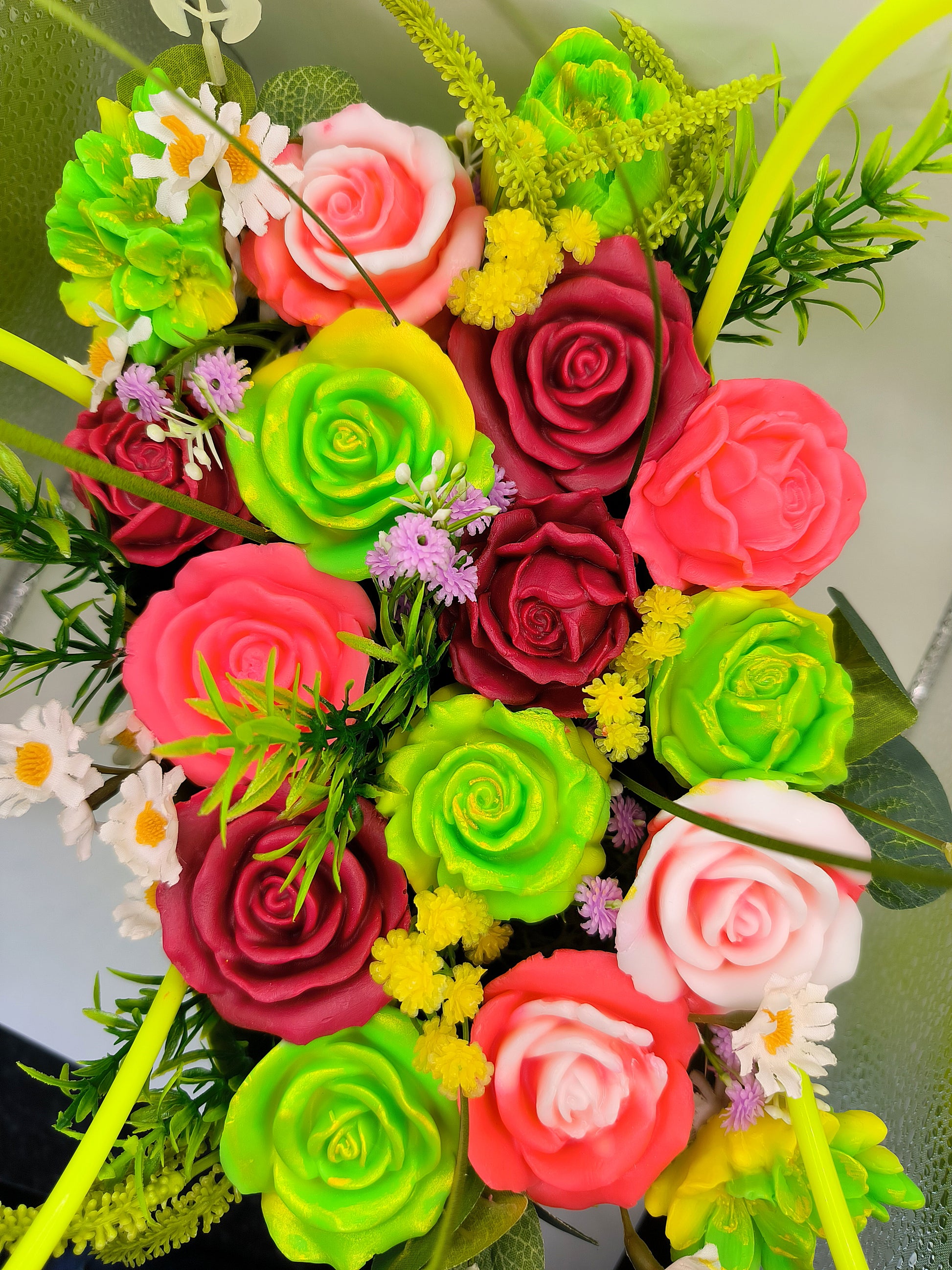 Indulge in the ultimate gift of beauty and relaxation with our Handcrafted soap bouquet. Carefully designed to mimic the elegance of fresh flowers, each bouquet is composed of premium, hand-poured soaps in a variety of delicate scents and colours. Soap will leave your skin feeling soft and rejuvenated. This soap bouquet has playful,fresh fragrance of fruits.