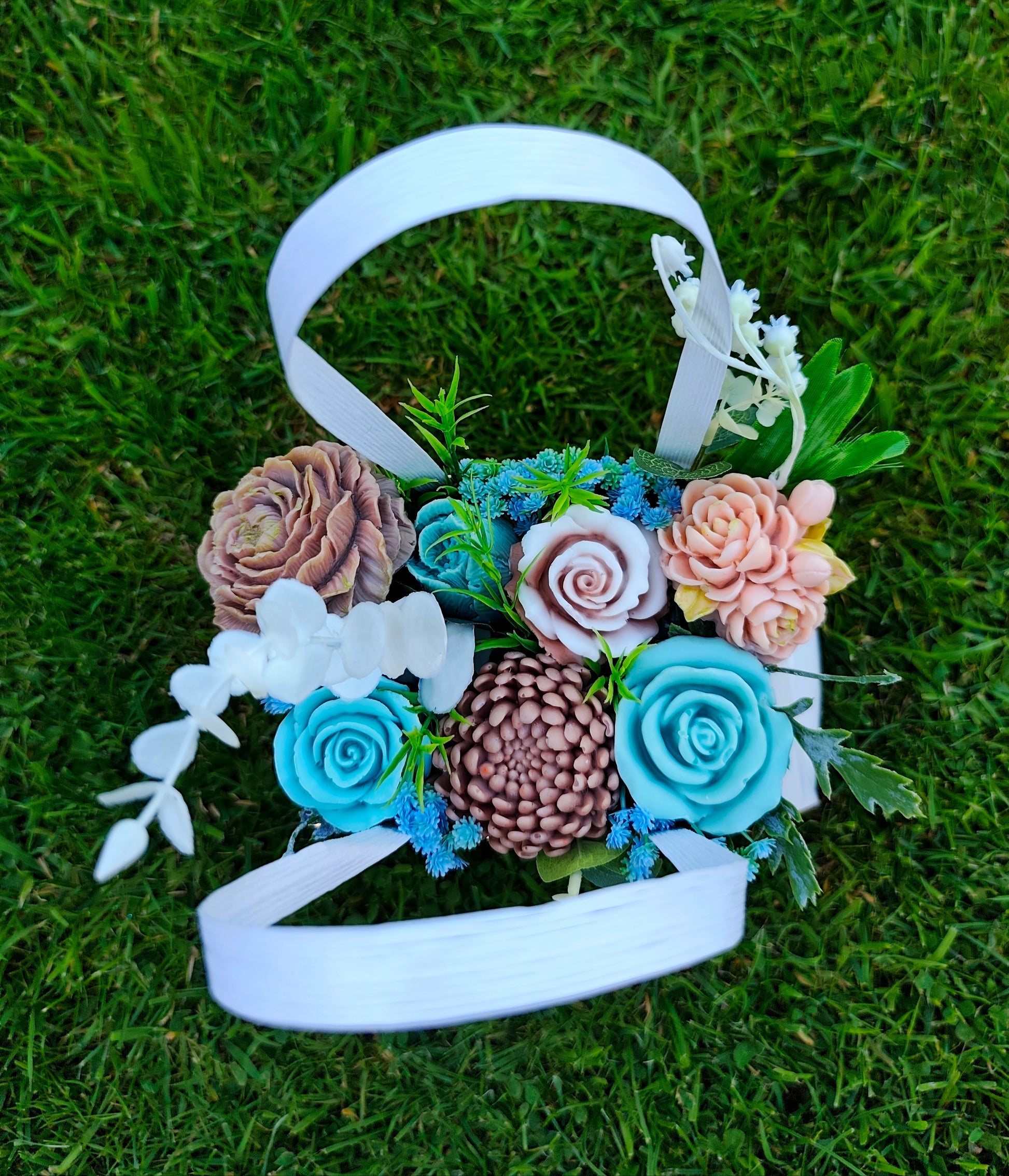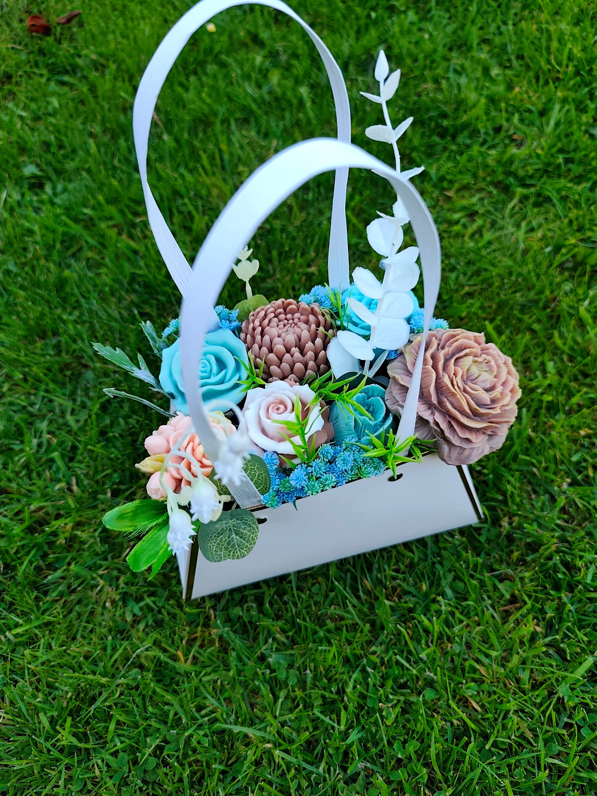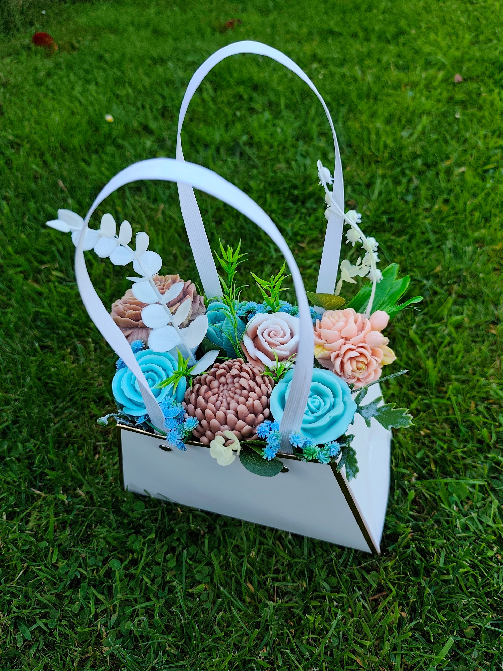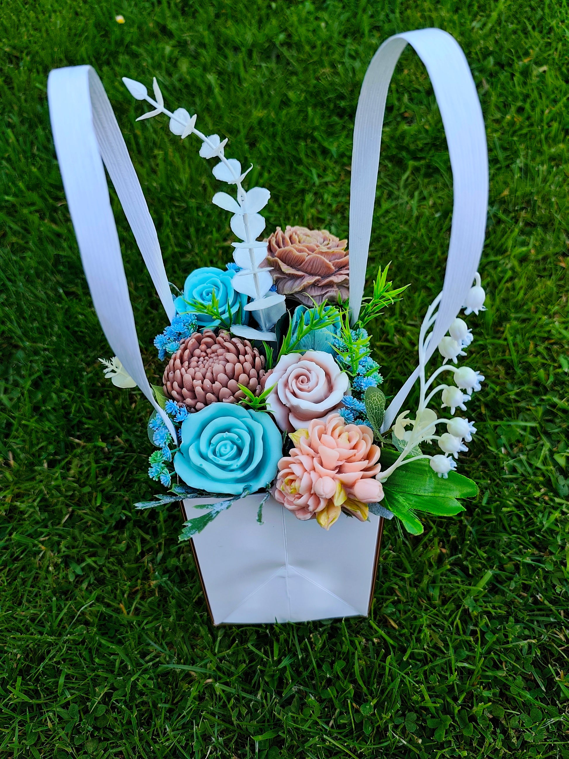 Delightfully elegant, this handcrafted soap flower bouquet features pastel blues, soft pinks, and earthy neutrals in a sleek white gift bag—perfect for gifting or elevating your home décor. A long-lasting, scented alternative to fresh flowers, ideal for birthdays, thank-yous, or relaxation moments.