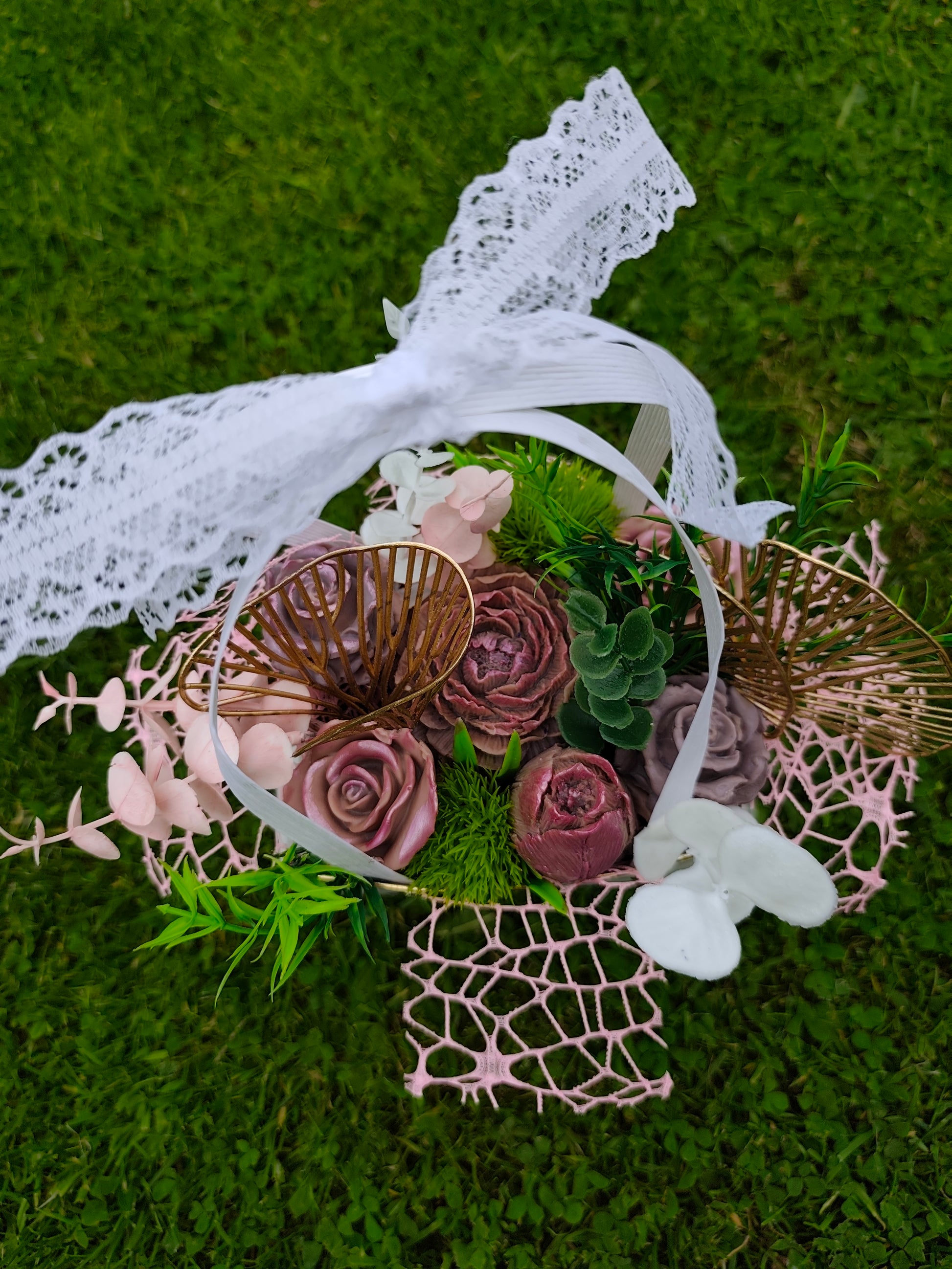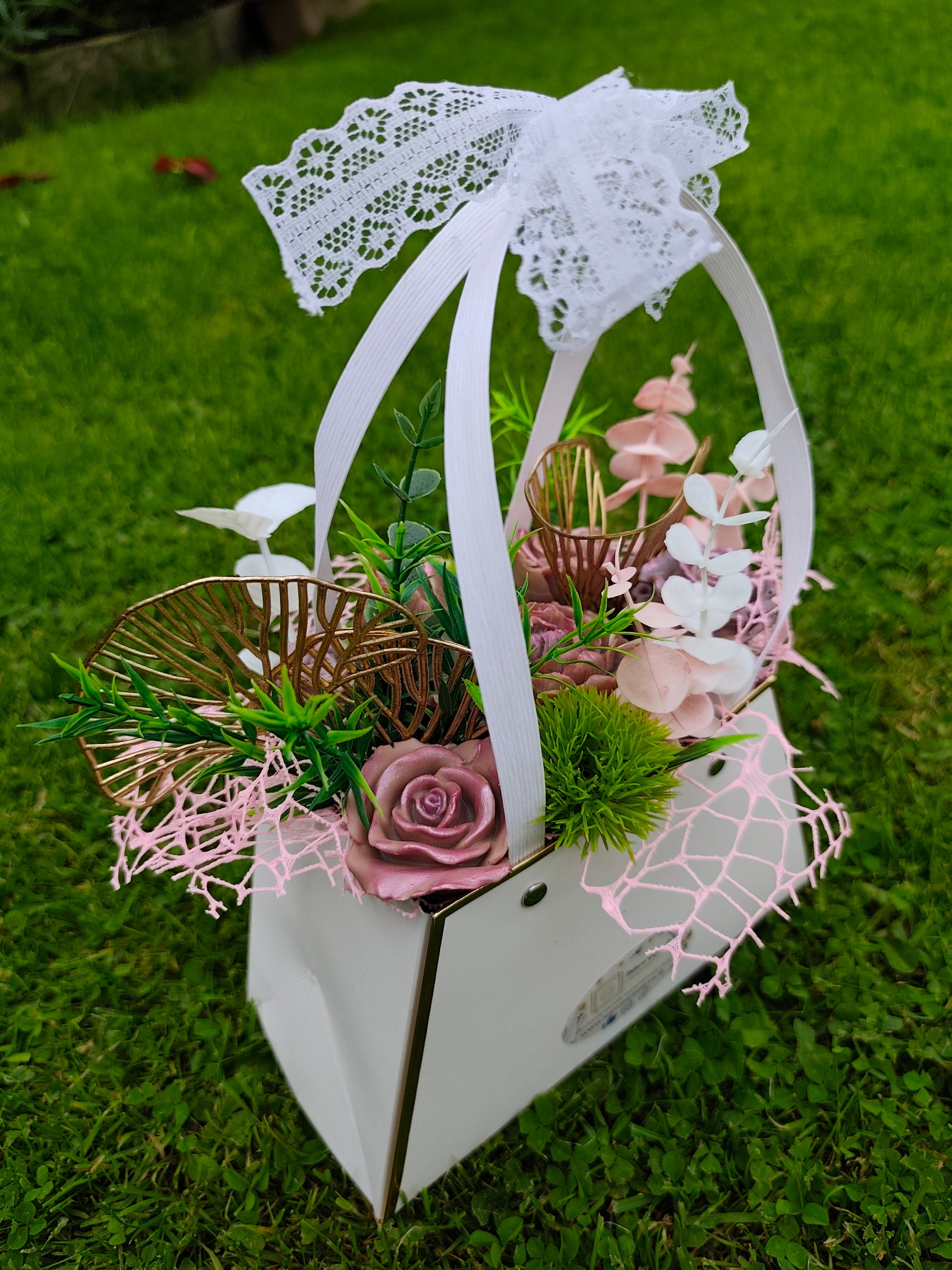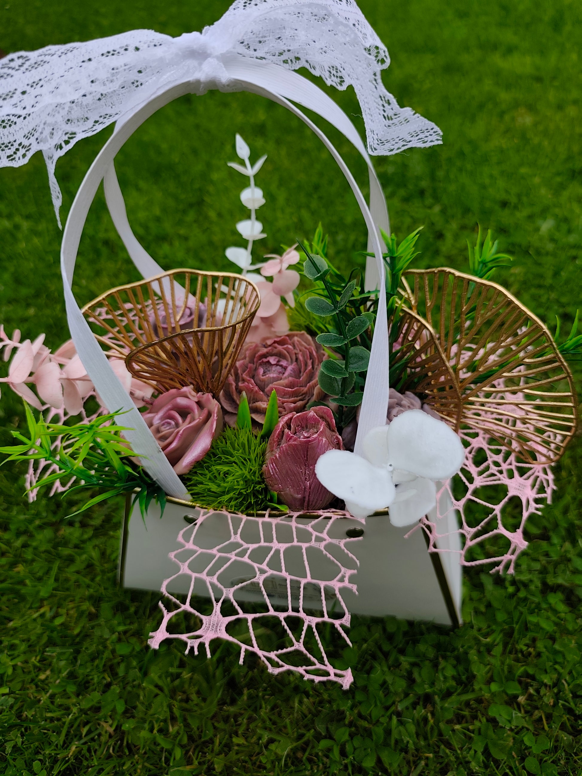 Chic and timeless, this handcrafted soap flower bouquet features soft blush tones, delicate botanicals, and metallic accents, all beautifully arranged in a white gift bag-style box with a lace ribbon handle. Infused with a gentle floral fragrance, it’s the perfect gift for birthdays, thank-you gestures, or stylish home décor.