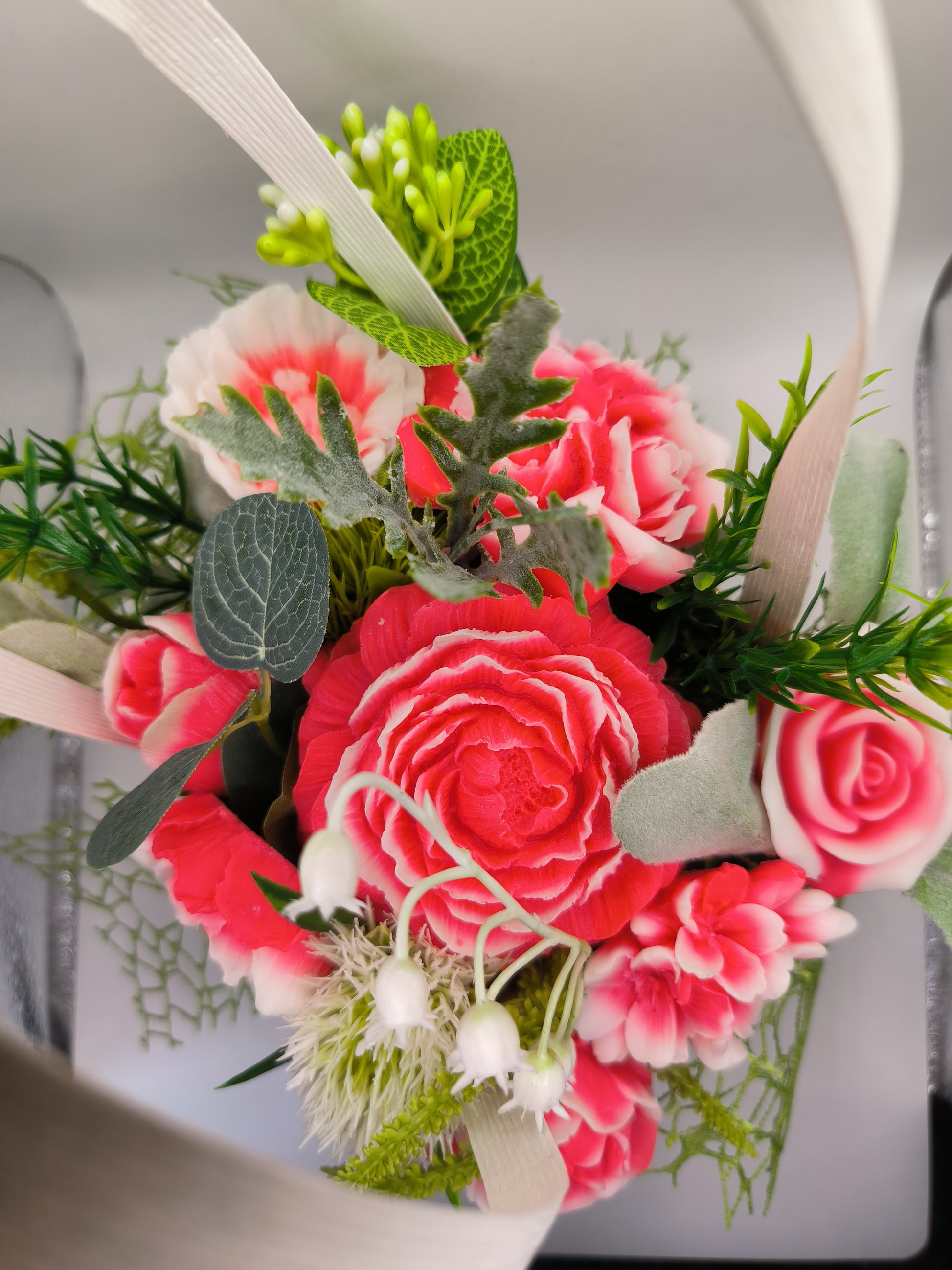 This unique soap bouquet will be dream to own. Will brighten up any room. Every soap flower is handpoured with slightest detail in mind. It will fill your space with fruity aroma. Made of glycerine soap. Vegan friendly and cruelty free.