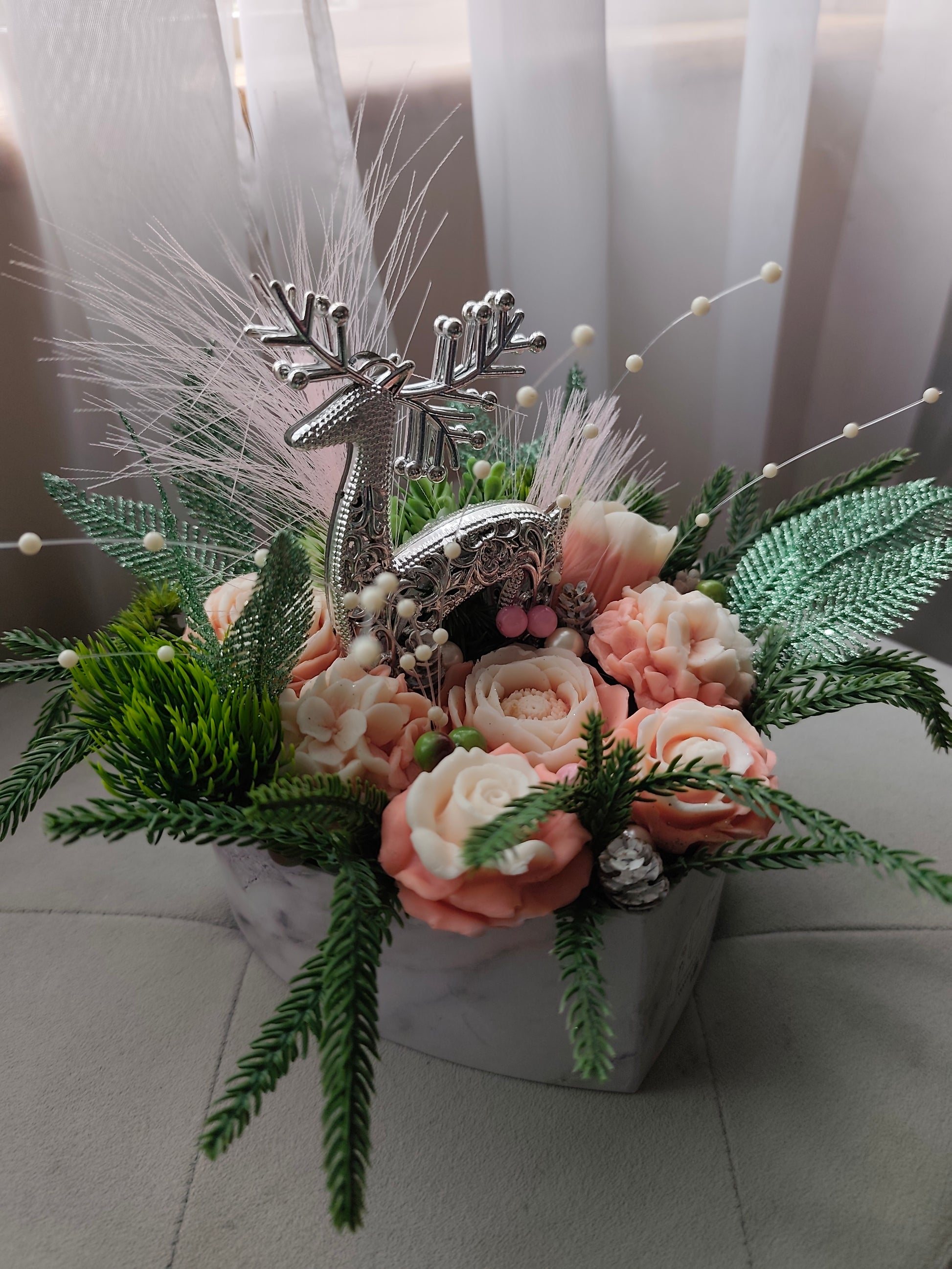 Festive Floral Soap Bouquet – A luxurious Christmas arrangement handcrafted from vegan-friendly soap and delicately scented. This elegant mix of flowers is beautifully complemented by festive greenery, sparkling ornaments, and a satin bow. Perfect as a unique eco-friendly gift or decorative centrepiece, it combines festive charm with the relaxing aroma for a truly special touch this holiday season.
