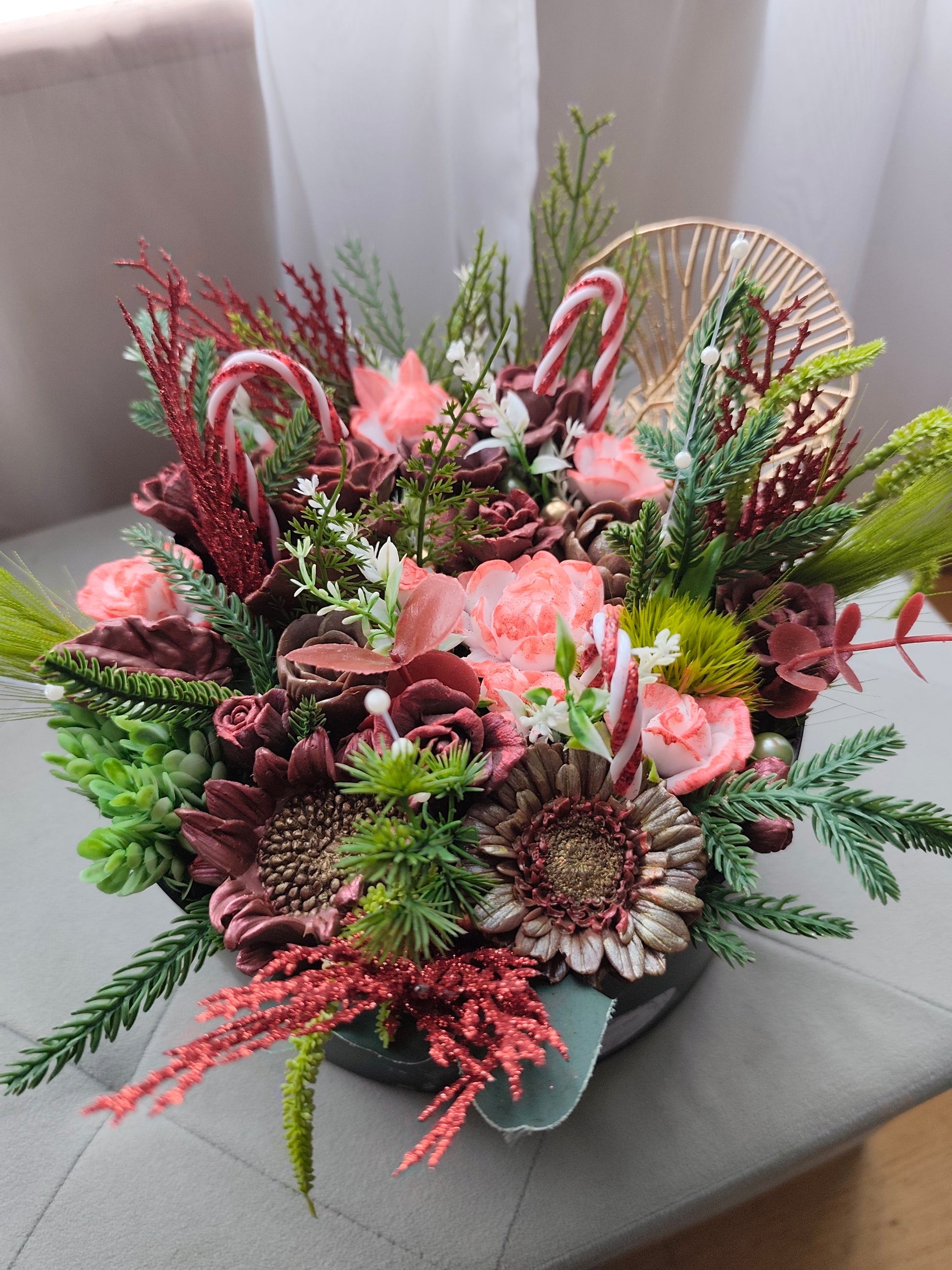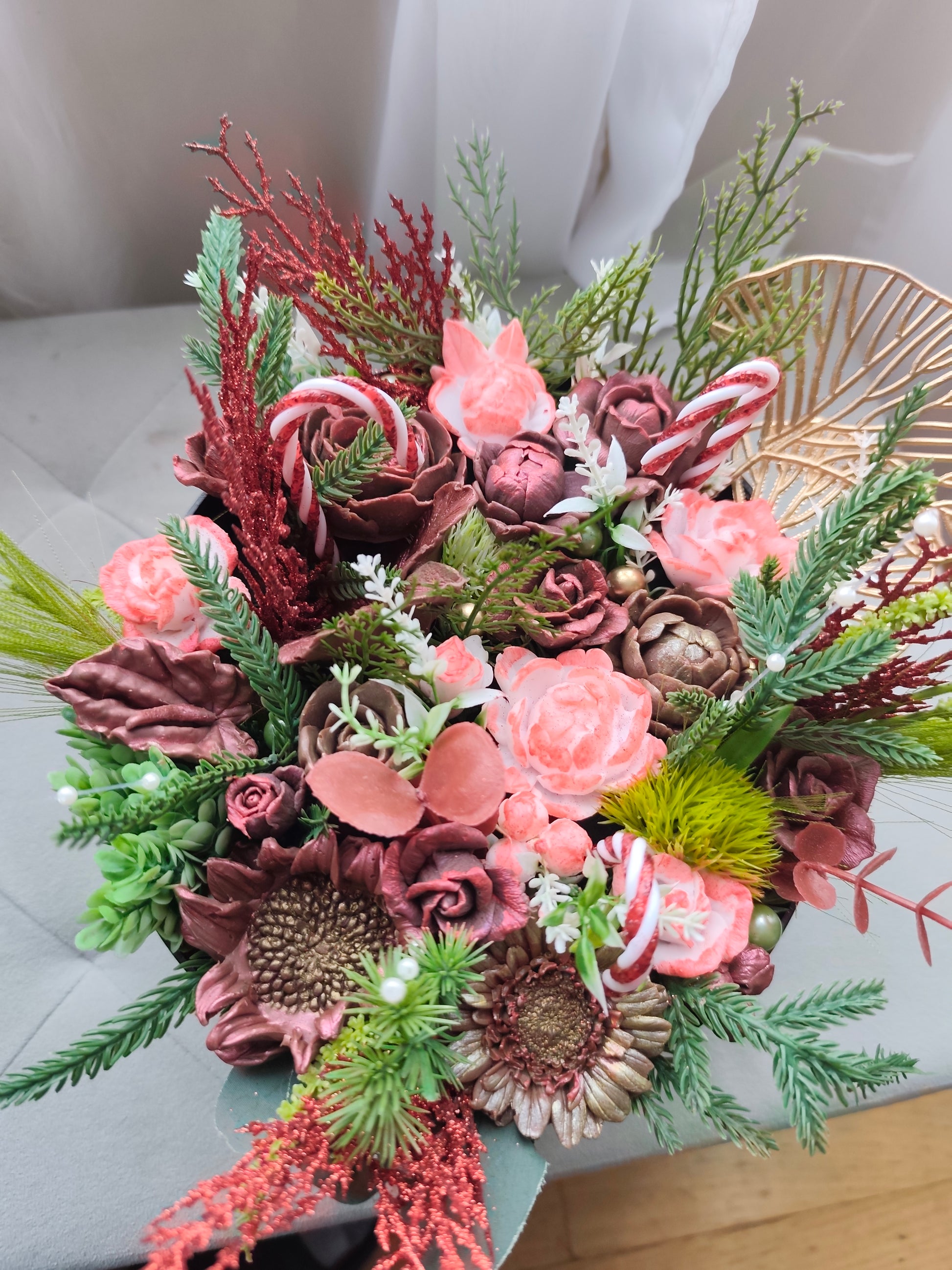 Tutti Frutti Christmas Soap Bouquet – A vibrant festive arrangement handcrafted from vegan-friendly soap and infused with a sweet, fruity tutti frutti fragrance. Bursting with colourful flowers, candy cane details, and festive greenery, this bouquet captures the joyful spirit of Christmas. Perfect as a cheerful eco-friendly gift or eye-catching holiday decoration, it combines playful design with a delicious fruity scent that brightens any room.